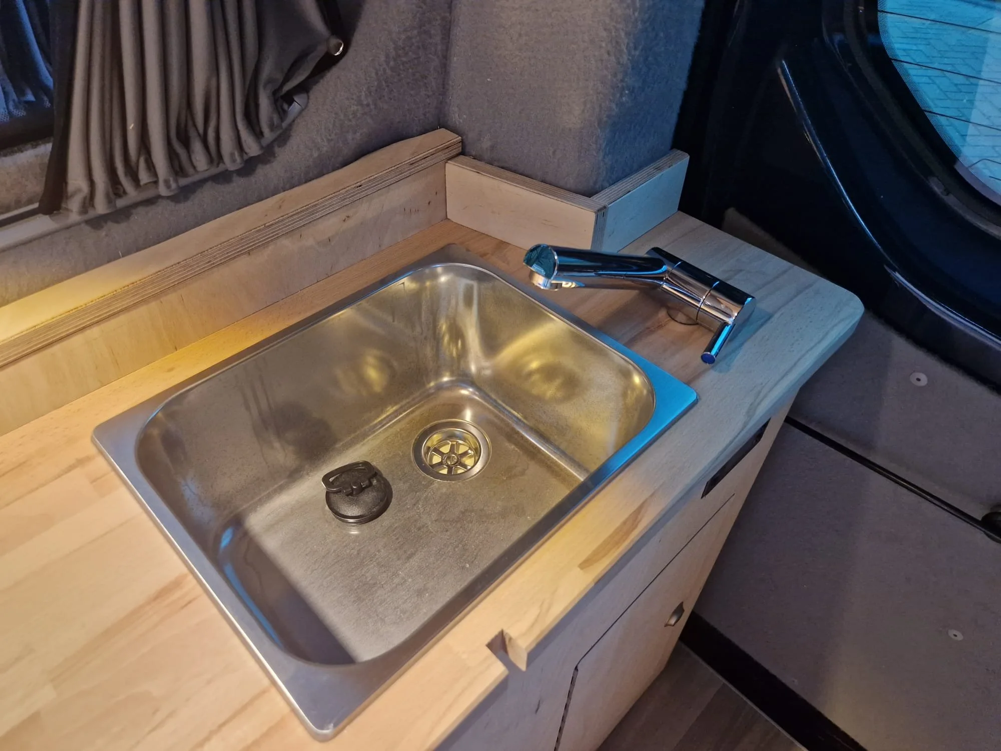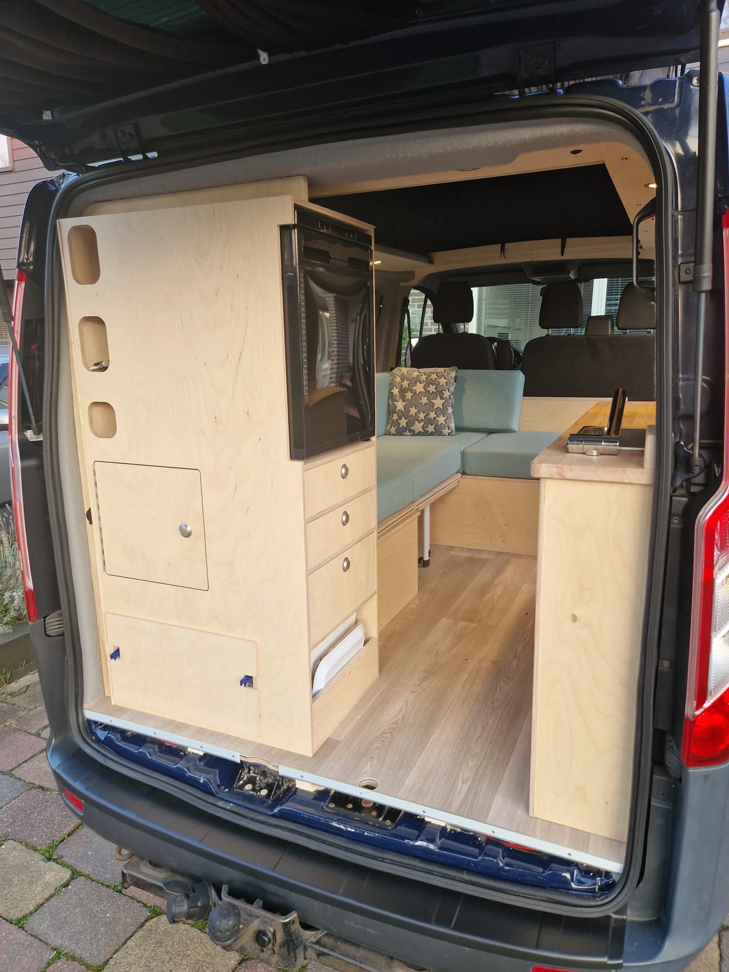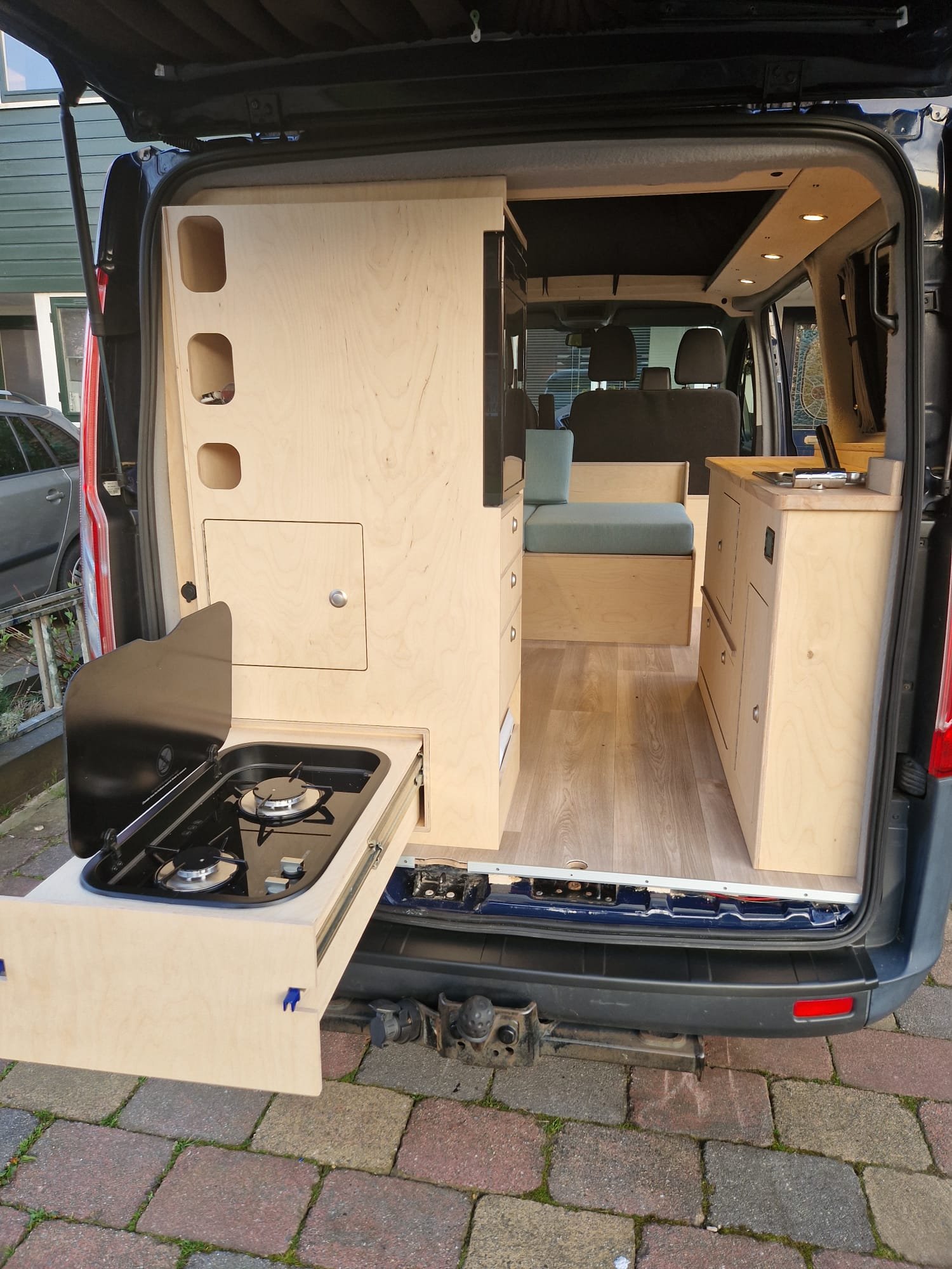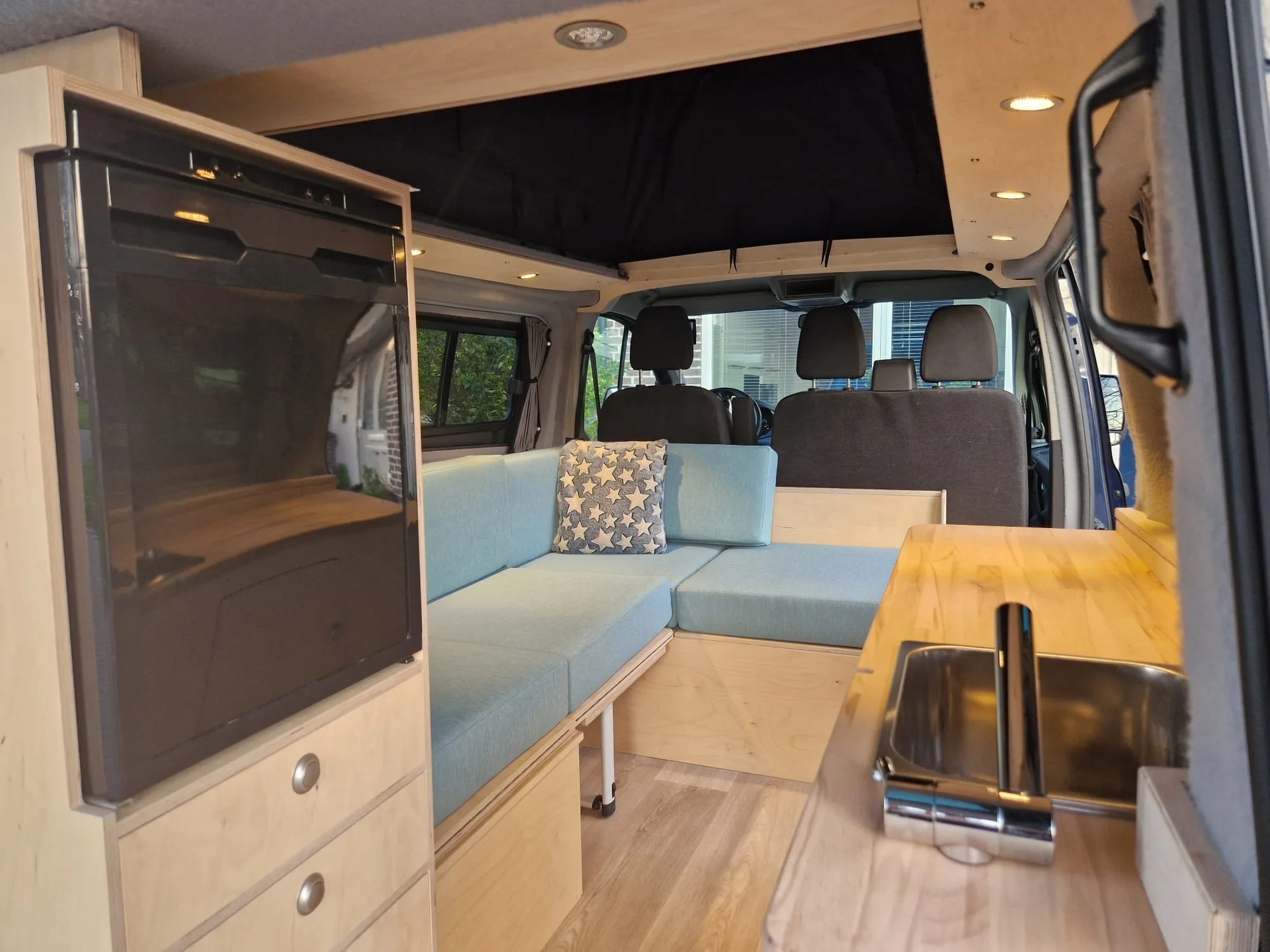 Ford Transit Custom L1H1In opdracht van Camper-interieur.nl hebben wij voor een Ford Transit Custom L1H1 een volledig camperinterieur ontworpen en ingebouwd, compleet met elektra en bekleding.